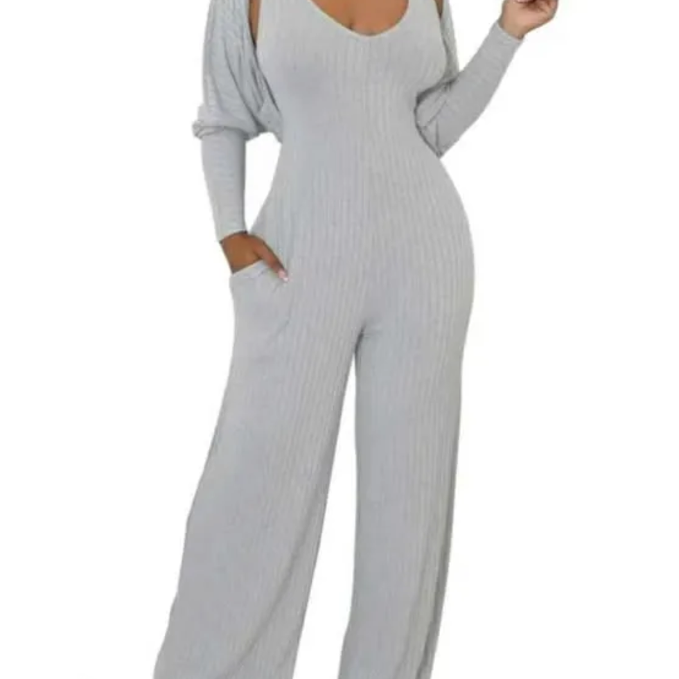 Meet the Hey Girl Jumper — the perfect mix of cozy and cute. This ribbed one-piece features a wide-leg fit, front pockets, and a playful cut-out sleeve detail that gives a simple look a little extra edge.